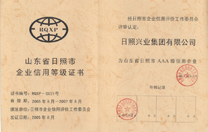 ·2007年3月,日照市企業(yè)信用評(píng)價(jià)工作委員會(huì)評(píng)審認(rèn)定興業(yè)集團(tuán)為“山東省日照市AAA級(jí)信用企業(yè)”