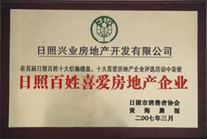 ·2007年3月,興業(yè)房地產(chǎn)被日照市消費(fèi)者協(xié)會(huì)日照百姓喜愛房地產(chǎn)企業(yè)