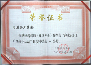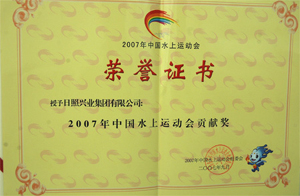 ·2007年9月,中國(guó)水上運(yùn)動(dòng)會(huì)組委會(huì)授予日照興業(yè)集團(tuán)有限公司“中國(guó)水上運(yùn)動(dòng)會(huì)貢獻(xiàn)獎(jiǎng)”