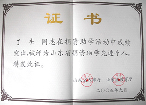 · 2005年9月,丁杰董事長榮獲“山東省捐資助學先進個人”榮譽稱號