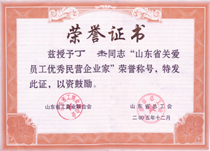 · 2005年12月,丁杰董事長榮獲“山東省關愛員工優(yōu)秀民營企業(yè)家”榮譽稱號