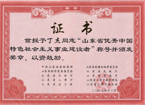 · 2007年12月,丁杰董事長榮獲“山東省優(yōu)秀中國特色社會主義事業(yè)建設者”榮譽稱號
