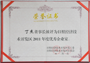 ·2012年1月,丁杰董事長被評為“日照市經(jīng)濟技術開發(fā)區(qū)優(yōu)秀企業(yè)家”榮譽稱號