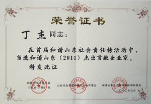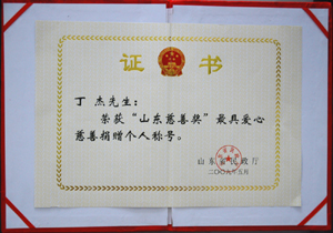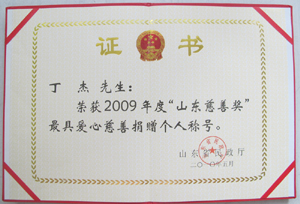 · 2009年5月,丁杰董事長榮獲“山東慈善獎”最具愛心慈善捐贈個人榮譽稱號