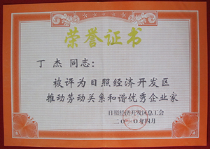 · 2010年4月,丁杰董事長榮獲“日照經(jīng)濟開發(fā)區(qū)推動勞動關系和諧優(yōu)秀企業(yè)家”榮譽稱號