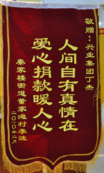 · 2010年2月,敬贈興業(yè)集團董事長丁杰“人間自有真情在,愛心捐款暖人心”錦旗
