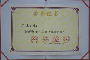 · 2008年5月,丁杰董事長榮獲“2007年度慈善之星”榮譽稱號