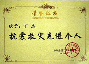 · 2008年12月,丁杰董事長榮獲“抗震救災先進個人”榮譽稱號