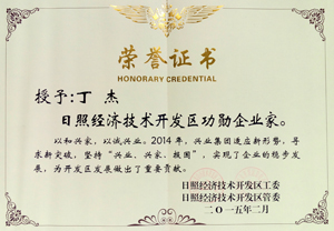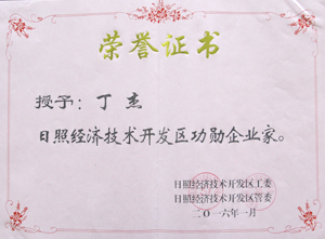 ·2015年2月,日照經(jīng)濟技術開發(fā)區(qū)授予丁杰董事長“日照經(jīng)濟技術開發(fā)區(qū)功勛企業(yè)家”稱號。