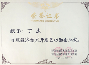 ·2017年2月,日照經(jīng)濟技術開發(fā)區(qū)授予丁杰董事長“日照經(jīng)濟技術開發(fā)區(qū)功勛企業(yè)家”稱號。