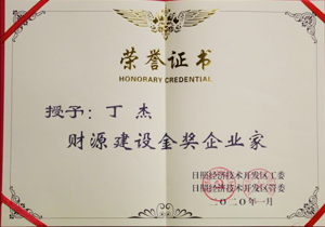·2020年1月,日照經(jīng)濟技術開發(fā)區(qū)授予丁杰“財源建設金獎企業(yè)家”