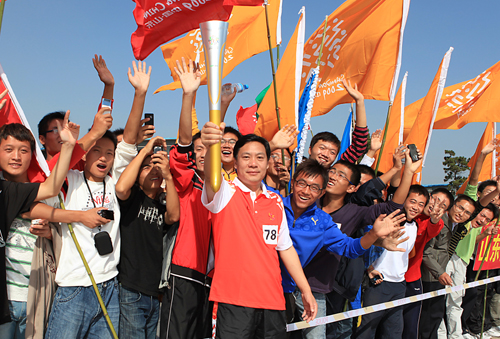 丁杰董事長作為全運會火炬日照傳遞活動的第七十八棒火炬手,參加了萬平口海濱生態(tài)廣場段的后三棒火炬?zhèn)鬟f。在等候火炬?zhèn)鬟f的空隙,他接受了日照電視臺記者的采訪。他說,第十一屆全運會火炬?zhèn)鬟f活動在我市舉行,將進(jìn)一步促進(jìn)“和諧中國,全民全運”理念的傳播與普及,進(jìn)一步激發(fā)全市人民關(guān)心、 支持、參與和奉獻(xiàn)全運會的熱情。他表示,作為一名民營企業(yè)家代表能成為全運會的一名火炬手,他感到十分光榮和自豪,表示要把全運會的精神帶到企業(yè)中去,推動企業(yè)更好更快發(fā)展,為日照經(jīng)濟和社會各項事業(yè)的發(fā)展貢獻(xiàn)力量。采訪結(jié)束后,圍觀的群眾紛紛要求同丁杰董事長合影留念,他都欣然接受。10時左右,在現(xiàn)場觀眾的熱烈掌聲和歡呼聲中,丁杰董事長從上一棒火炬引燃了自己手中的“如意”火炬,高高舉在頭頂向圍觀人群示意,開始了神圣的火炬?zhèn)鬟f……