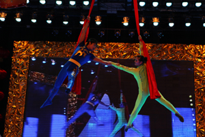 整場晚會(huì)以興業(yè)集團(tuán)成立10周年走過的光輝歲月為主線,在興發(fā)公司選送的歌伴舞《吉祥頌》中拉開了帷幕,伴隨著激越的鼓點(diǎn)、歡快的舞蹈、喜悅的歌聲,霎時(shí),千米演播大廳成為了歡樂的海洋。興業(yè)房產(chǎn)公司選送的歌舞《紅旗飄飄》、《愚公移山》,唱出了興業(yè)人對(duì)偉大祖國的熱愛和百折不撓的創(chuàng)業(yè)精神;興業(yè)汽配公司選送的《前門情思大碗茶》京味十足,集團(tuán)機(jī)關(guān)選送的原生態(tài)陜北民歌《山丹丹花開紅艷艷》和青春奔放的流行歌曲《改變自己》,展現(xiàn)了興業(yè)人多才多藝的時(shí)代風(fēng)采;天泰鋼構(gòu)公司田雯雯一曲《美麗心情》抒發(fā)了興業(yè)人對(duì)美好生活的熱愛和追求;房產(chǎn)公司姑娘們表演的富有濃郁民族特色的新疆舞《西域風(fēng)情》,勾起觀眾對(duì)邊疆風(fēng)情的片片遐想。集團(tuán)機(jī)關(guān)創(chuàng)作的配樂詩朗誦《興業(yè)十年頌》和音樂群口快板《說唱興業(yè)房產(chǎn)》,讓全場觀眾打開記憶之門,重溫了興業(yè)集團(tuán)10年的發(fā)展歷程,更是喚醒了興業(yè)人強(qiáng)烈的歷史使命感和自豪感,迸發(fā)出一股強(qiáng)大的自我升華的豪邁激情。青島永杰的姑娘們帶來的《激情水鼓》,奏響迎春盛典,震耳欲聾的鼓聲配合激昂的音樂,水花飛濺,光芒四射,引爆全場激情。友誼商店的姑娘們表演的運(yùn)動(dòng)時(shí)裝秀和社區(qū)老年人表演的太極功夫扇《夕陽美》,活力十足的青春魅力與剛?cè)岵?jì)的白發(fā)矍鑠,演繹出了一幅興業(yè)大家庭的和諧美景。公司選送的小品《風(fēng)波》和興發(fā)公司選送的山東快書《大老郭趕春晚》,情趣交融,令人捧腹,反映出了當(dāng)代建筑工人的情感世界和興業(yè)人對(duì)企業(yè)的無限熱愛之情。雜技《夢幻藍(lán)綢》驚險(xiǎn)刺激,動(dòng)人心魄,引起場下觀眾陣陣驚呼。當(dāng)全場觀眾期待已久的北京《OOB美少女組合驚艷亮相時(shí),場下掌聲雷動(dòng),歡呼一片,動(dòng)感十足的青春美少女用她們的成名作《地球媽媽》和一首《心想事成》,甜歌勁舞,征服了全場觀眾,再掀晚會(huì)新高潮。“山一樣的氣魄,海一樣的魂,春天里走來了興業(yè)人”,伴隨著晚會(huì)主題歌曲《興業(yè)春天》的響起,《興業(yè)春天》興業(yè)集團(tuán)2010年春節(jié)聯(lián)歡晚會(huì)華彩落幕。